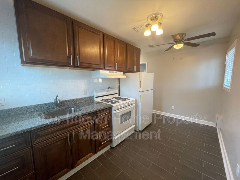 - Kitchen features granite countertop, gas range