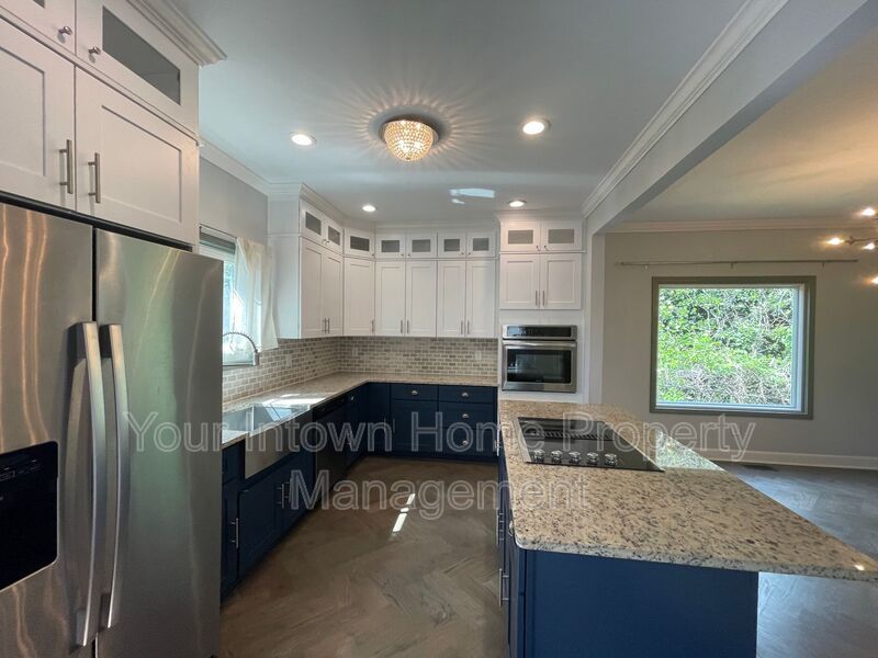 - Kitchen features SS appliances, white & blue cabinets, granite countertops
